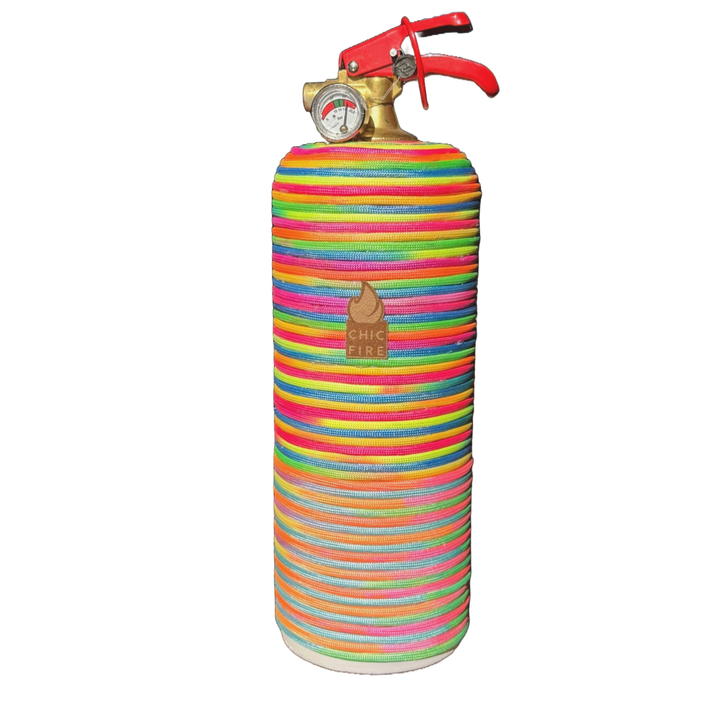 Bring a unique splash of colors to your interior. RAINBOW is everything a fire extinguisher is not: beautiful and unique. This piece was made with rainbow chords delicately positioned around the steel barrel. It took Sophie 4 hours of meticulous work to accomplish it. It was quite mesmerizing and was recently curated by a Fortune 500 company as gifts from the CEO to all direct reports.